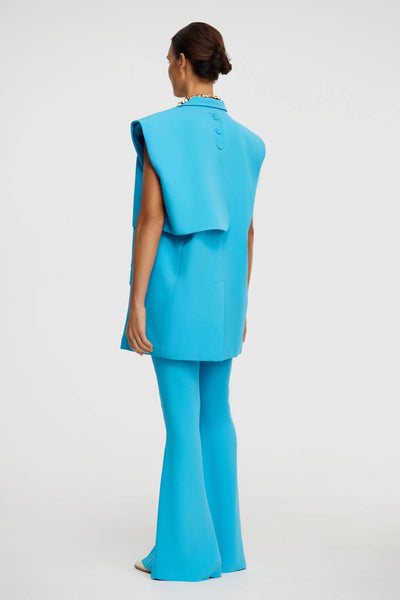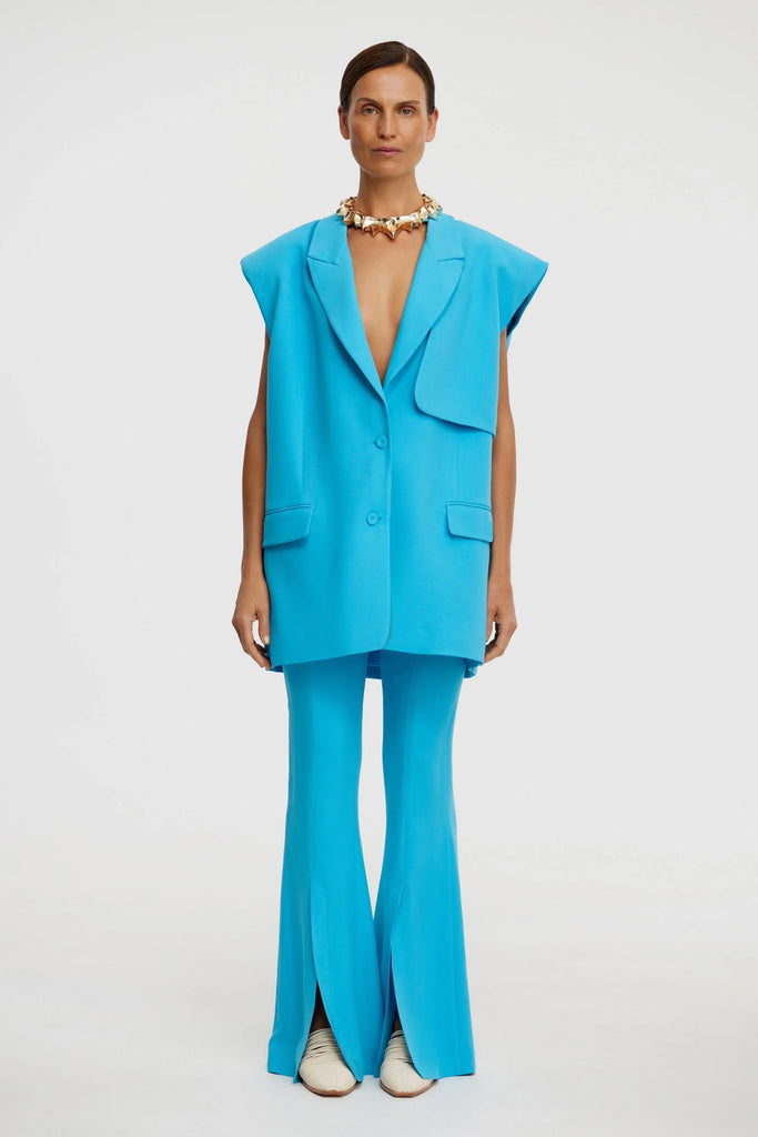 Introducing the Padworth Vest in Aqua, a sleek and structured piece that brings a pop of colour to your wardrobe. This woven vest features bold shoulder pads for a striking silhouette and a clean centre front button closure for a polished finish. Fully lined for comfort, the Padworth Vest effortlessly blends modern tailoring with a vibrant hue, making it a standout layering piece.