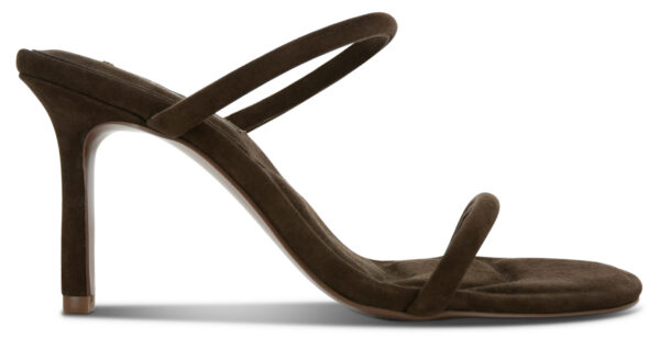 Cocoa suede high heeled sandals featuring padded straps with a sculpted round toe