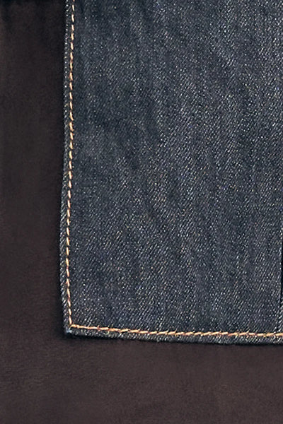 Long sleeve shirt in a dark wash denim contrasted with a black cotton poplin.