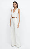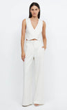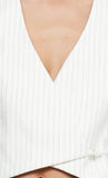 The Lou Pinstripe Vest is a chic and effortless style crafted from a linen blend, pinstripe fabric and designed in a relaxed-fitted silhouette. Cropped top features v-neckline and straps with e-hook hardware at the front wrap and back for shaping. Styled with our Lou Pinstripe Pant.