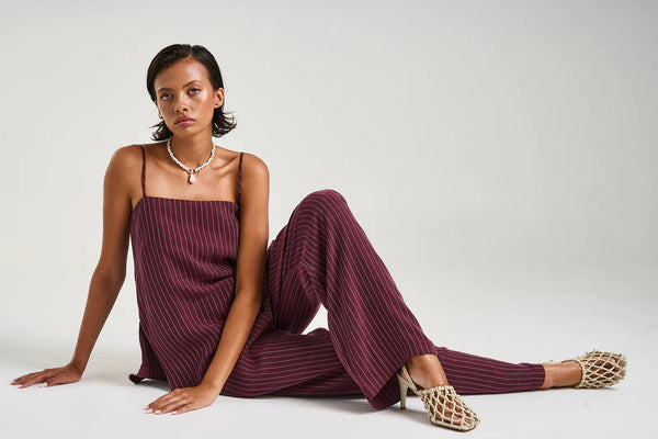 The Kina Pinstripe Tunic Top has been crafted from 100% premium cupro and boasts a straight cut bodice, adjustable straps, and a flowing body with side slits for style and functionality.