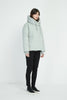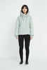 Cropped length heavy jacket coat with rib trims. Designed to be worn as a heavy outer layer, featuring extended neckline with drawstring, open-ended zip on the side, front pockets and panel quilting detail.
