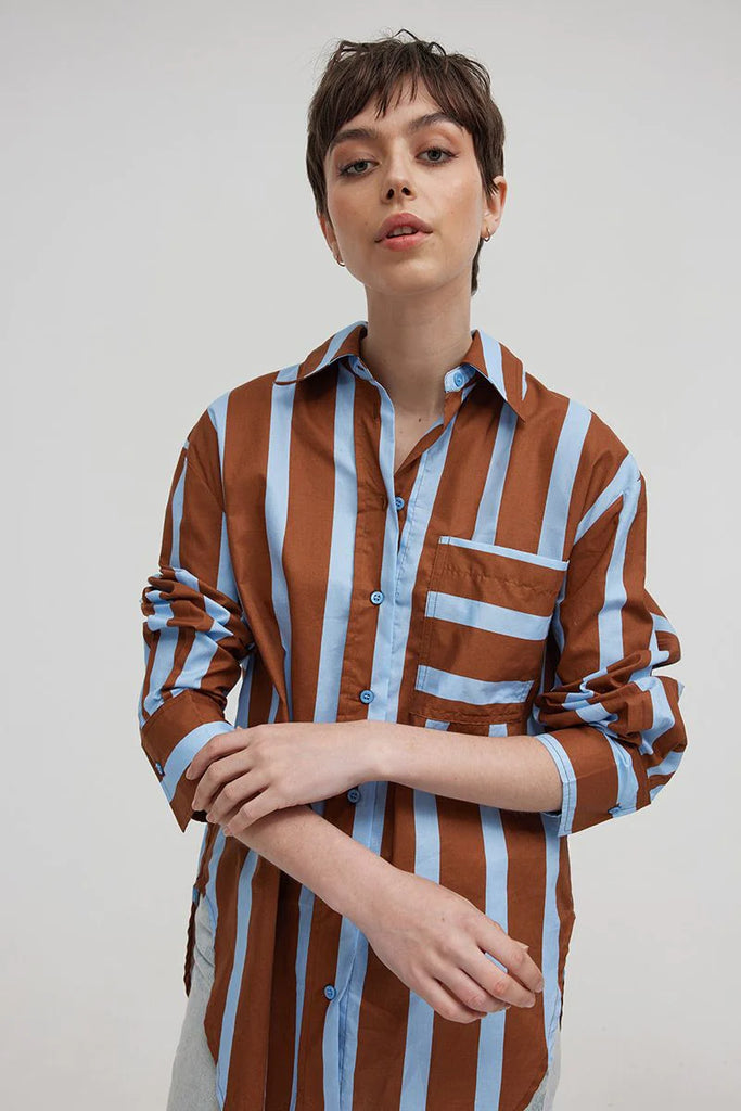 The Buddy oversize shirt in Azure/Terra Stripe cotton poplin featuring double stripe pocket and locker loop detail in contrasting Vitamin C. Our shirt showcases signature ASTON branding placard on the yoke.