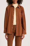The Claude Shirt is made from a heavy weight cotton poplin which has a soft peached handfeel. Silhouette is oversized throughout. Features include a front patch pocket, traditional shirt collar and front button opening, curved hem shape and contrast thread colour.