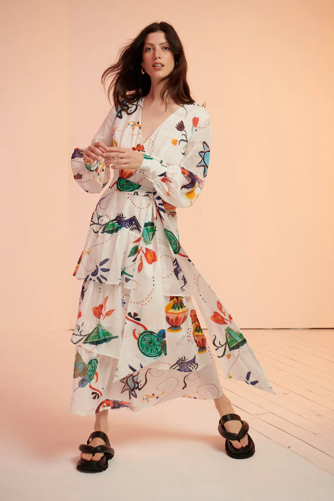 The Cordia Volume Dress in Santiago, a Kate Ford exclusive hand-drawn print from our Fall 2022 Collection, Sunstone in collaboration with Australian artist, Helen McCullagh. A light weight Ramie fabrication featuring Helen McCullagh exclusive hand-painted elements, frilled skirt with layered panels, flattering v-neckline, puff sleeves, zipper cuff openings and a self tie waist belt.
