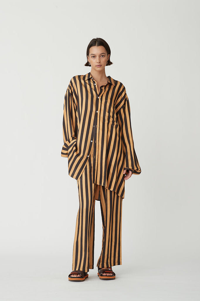 Blanca’s easy to wear long sleeve shirt is made from soft rayon with a colourful vertical stripe in a palette of peach and navy.