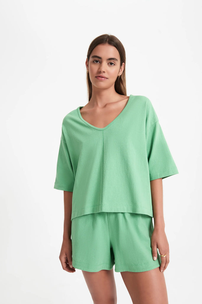 The Fes Top is made in a premium 100% cotton jersey. The silhouette is relaxed with a boxy fit, featuring a ribbed neckline, short sleeves and small side slits at the hem. Pair with the Fes Shorts for a coordinated look.