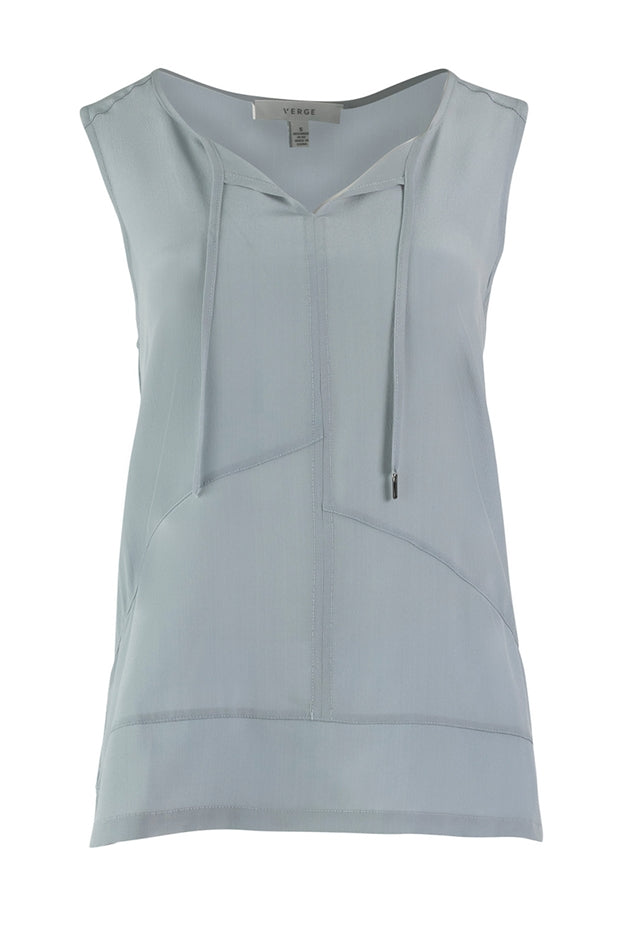 Sleeveless Tank with silk front panels and V neckline with ties.