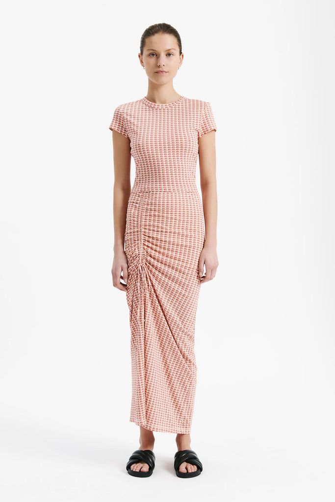 Made from a soft 100% cotton jersey with a lightweight and breathable handfeel, the Rhys Tee is printed in our exclusive 'Zenith' print. Silhouette is fitted with length finishing mid length. Features include an encased elasticated waistband and a ruched drawstring detail down the wearers right side creating a side slit. Skirt is half lined to mid thigh. Pair with the Rhys Tee for a coordinating look.