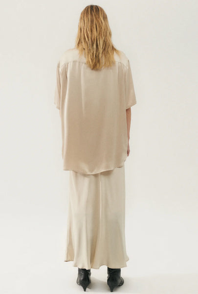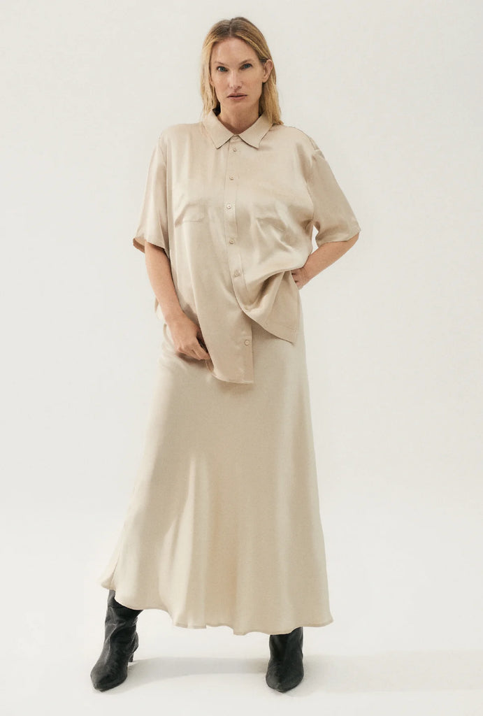 Designed to echo an original menswear style, cut from a glossy sandwashed silk. A relaxed fix is paired with a button-down front and utility pockets to create the versatility needed in everyday life. Perfect half-tucked into a mini skirt or pants, or worn half-buttoned over a slip dress.