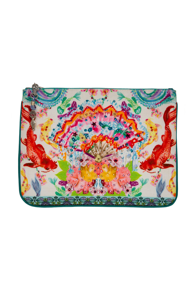 Empowered by her strong stance and soulful heart, the Dragon Divinity Small Canvas Clutch evokes Japan's enchanting sea creatures and mythical dragon folklore with a dreamy watercolour print. This bejewelled canvas clutch features a convenient zip pocket, contrast-piped trim and an opulent beaded zipper charm.