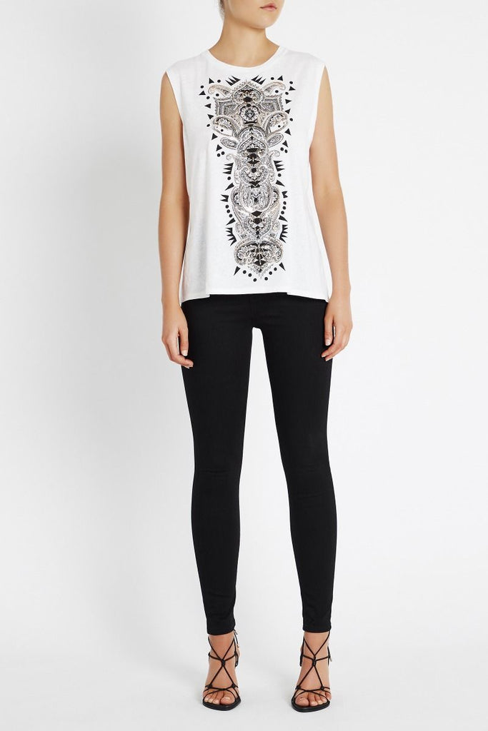 Made from a soft cotton-linen blend fabric, this ivory tank features a relaxed fit in a boxy style, with dropped armholes, a neat crew neckline and deep side splits finished with grosgrain ribbon. Across the front of the top is an intricate hand-drawn print finished with multi stone embellishment and sequinning.