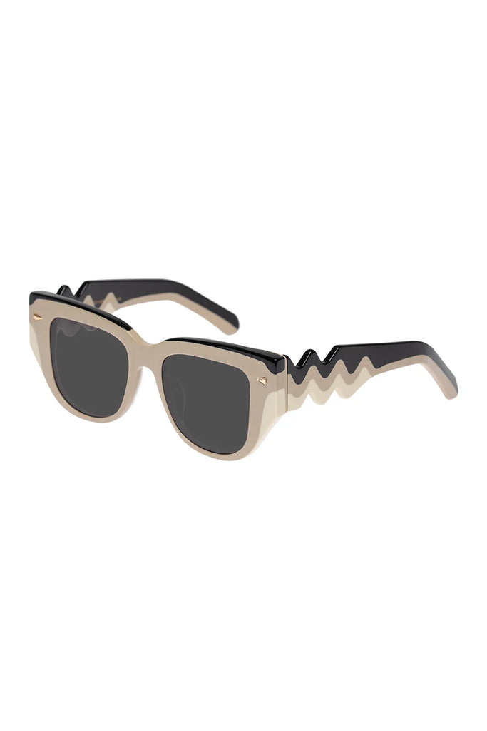 Continuing the evolution of a much-loved Karen Walker cat-eye silhouette, the True North Wave is our latest take on the True North’s wide squared-off shape energizing the style with a taste of psychedelia. Crafted in a mix of ‘70s-inspired neutrals that are layered along the striking frame and retro wavy arms that are then completed by our KW arrowhead pins at the temple for the signature finish. The sunglasses are fitted with dark smoke mono lenses to deliver drama and complement the graphic hues.